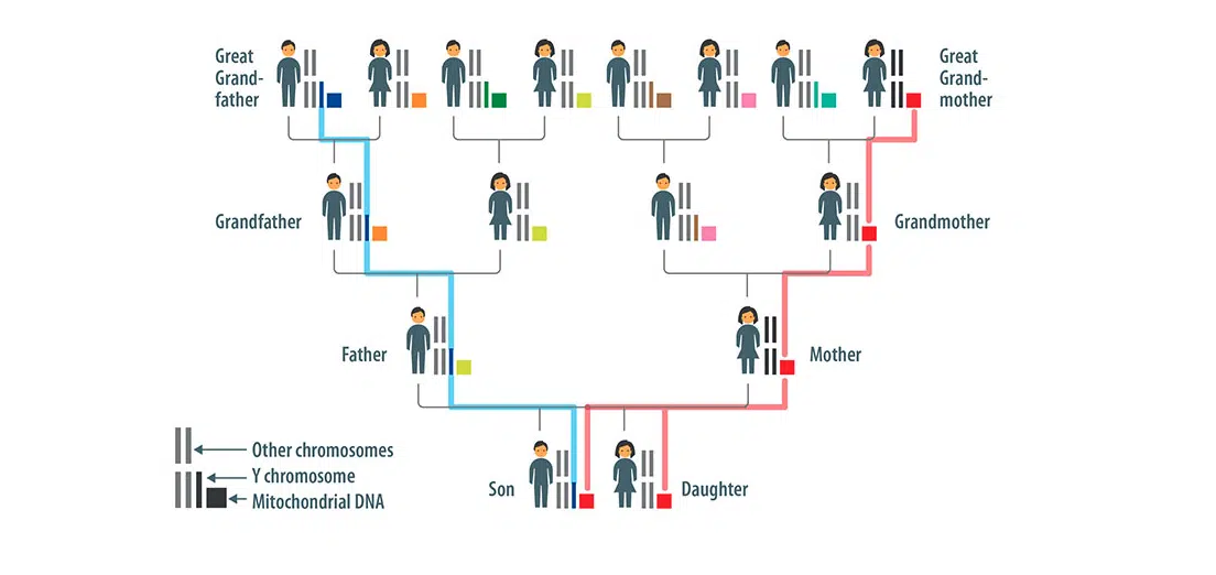 Humans have 23 pairs of chromosomes including the sex chromosomes which determine the male (XY) or female (XX) gender. The Y chromosome only exists in males, passed from father to son, generation after generation. For males, we can therefore analyse the genetic information in your Y chromosome to discover your paternal ancestry (from your father’s side of the family). Paternal ancestry is defined by a haplo group: a group of individuals who share the same genetic variation and have the same paternal ancestor. Paternal ancestry cannot be reported on in females because females do not carry a Y chromosome. Both males and females have mtDNA, but it is only passed on by female parents to offspring. A mother will pass her mtDNA on to all of her daughters and all of hersons. The mtDNA can therefore be analysed to find out your maternal ancestry(from your mother’s side of the family). Maternal ancestry is also defined by a haplo group, being a group of individuals who share the same genetic variation and have the same maternal ancestor.