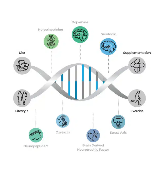 The Science:DNA Resilience reports on the seven key molecular areas that have the greatest influence on resilience. They are: stress axis, oxytocin, the neurotrophic pathway, neuropeptide Y, norepinephrine, dopamine, and serotonin. Given the hereditability of emotional regulation (30%), temperament (±56%) and cognitive aptitude (>99%), a critical knowledge and understanding of individual genetics and environmental influences can unlock exceptional resilience and a performance advantage regardless of circumstances. ‘From potential to performance’. ‘From surviving to thriving’